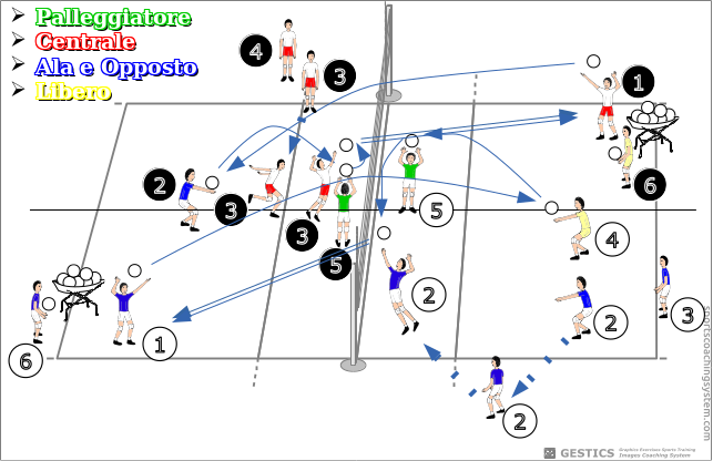 - nell’altra metà campo: un centrale batte (1), un laterale (2) riceve, il centrale (3) partendo al limite del campo e si porta in attacco, attacca in zona uno. Il palleggiatore può alzare anche la palla al laterale dietro, per un attacco da dietro in uno. Un centrale (4) aspetta e si alterna tutte le volte con il centrale (3) in attacco, Un libero (6) sta in assistenza e si preoccupa che al battitore non manchino mai i palloni.