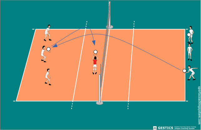 Tre giocatori sono dietro la linea di battuta. Uno alla volta batte dal basso verso l'altro campo. I giocatori in campo devono ricevere e appoggiare la palla sul palleggiatore