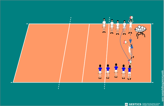 Formare due file una di fronte all'altra, il primo\a della prima fila prende la palla e con un passaggio la passa al primo\a della fila di fronte, che alza la palla verso il compagno\a della prima fila e il compagno\a la schiaccia, dopo aver finito il turno si va in fondo alla fila