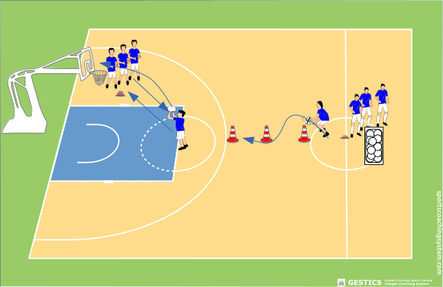 Un giocatore fa lo slalom tra i birilli, passa la palla al compagno, il compagno gliela ripassa e poi tira a canestro.
