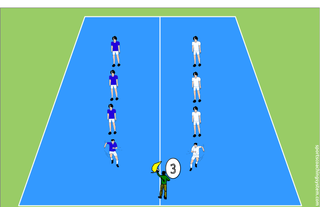 Nel campo ci sono due squadree ognuno a un numero che li viene assegnato e una persona tiene la bandierina .