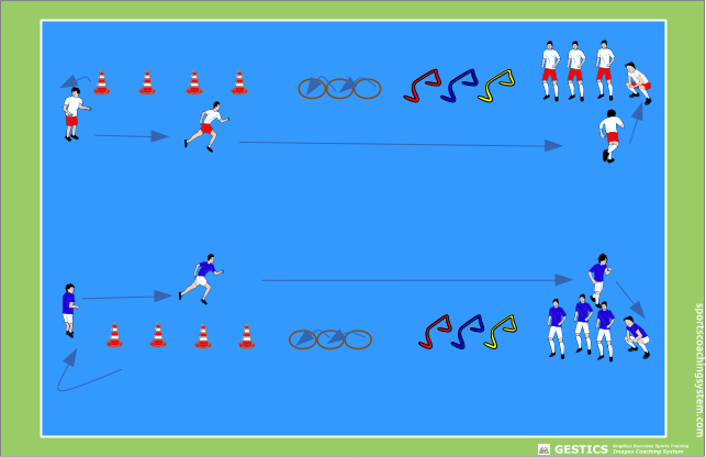 Due gruppi si mettono in fila uno di fianco all'altro. Al cenno del "via" partono due persone contemporaneamente, una di un gruppo e una dell'altro, prima saltando tre ostacoli bassi, poi saltando da un cerchio all'altro e infine facendo un breve slalom tra i birilli. Una volta finito il percorso le due persone devono correre molto velocemente, posizionandosi alla fine della fila. Il percorso va avanti così finché all'inizio della fila non ritorna la persona che ha iniziato.