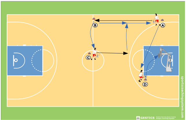 L’alunno X parte dal cinesinoA per arrivare al cinesinoB,da qui passa la palla al compagno Y che si trova nel cinesino C, il compagno Y correrà fino alla metà dei cinesini A e B, passerà la palla al compagno X che ricorrerà fino al cinesino A e passerà la palla al compagno Z che si troverà nel cinesino D ,pronto per il tiro.