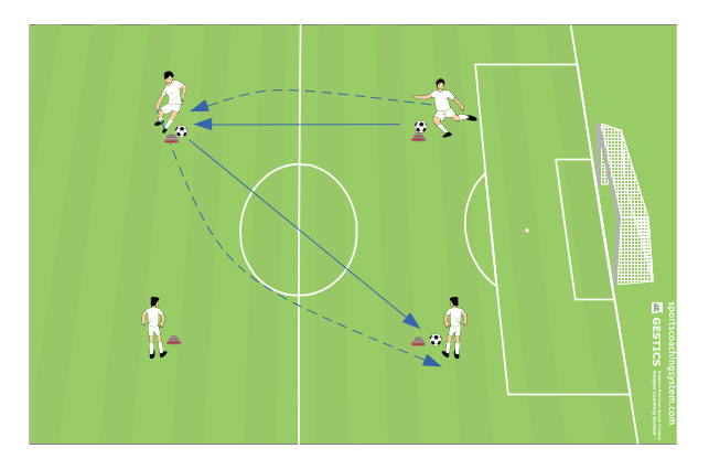 Si forma un quadrato con dei coni ai vertici dove in ogni angolo si trova una fila di giocatori. Si parte da un anglo con un pallone che lo andrà a passare al giocatore alla sua destra che dopo aver ricevuto il pallone lo giocherà in obliquo al terzo uomo e, dopo aver passato il pallone, farà uno scatto verso il cono di fronte a lui. A quel punto si ripeterà la stessa azione continuamente per circa 7 minuti.