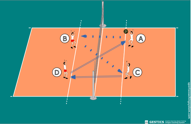 Ci si dispone su 4 file: 2 da una parte della rete e 2 dall'altra parte della rete. Al via la fila A passa la palla di fronte al di la della rete alla fila B. La fila B con un palleggio incrociato palla la palla alla fila C che si trova al di la della rete. La fila C palla la palla alla fila D con un palleggio di fronte. La fila D con un palleggio incrociato ripassa la palla alla fila A. Sulle 4 file si troveranno disposti 7 alunni. Dopo ogni passaggio l'alunno si sposta in fondo alla propria fila. Terminato 1 giro gli alunni passano dalla fila A alla B, alla C, alla D e fino a quella iniziale