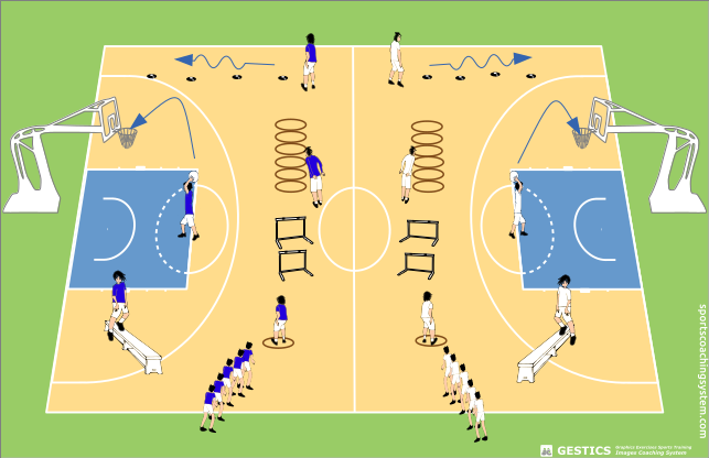 Ostacoli, cerchi, cinesini, pallone da basket, panca.