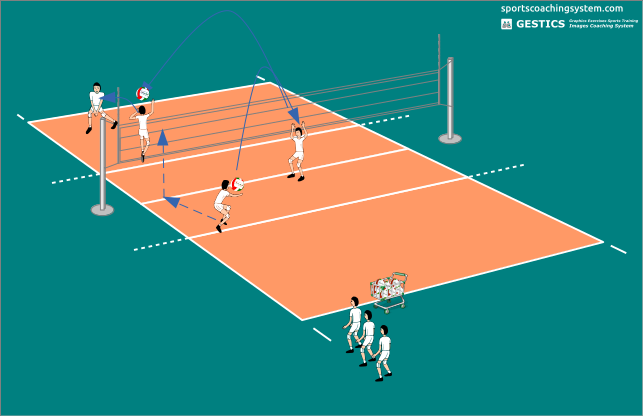 I giocatori si metteranno in zona 1 di un campo e in zona 3 e 4 dell'altro, il resto del gruppo si metterà in fila fuori dal campo ad aspettare il proprio turno. La palla partirà dalla persona in zona 4 che lancerà una palla alla zona 3, dall'alto verso il basso simulando il bagher. L'alzatore, che si trova in zona 3, bloccherà la palla in alto vicino alla fronte e palleggerà in zona 4 dove il giocatore lancerà una palla verso il compagno che si trova nell'altro campo. Il giocatore che sta in zona 1 bloccherà l'attacco in posizione di bagher o di palleggio. Si gira seguendo la palla, cioè il primo della fila va in zona 4, chi si trovava in zona 4 va in zona 3, chi era in zona 3 va in zona 1 e chi era in zona 1 va in fila.