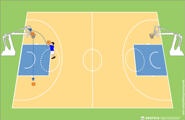 Pendere una palla da basket in mano e cercare di creare una spece di mirino con le mani. Dopo aver creato il mirino e averlo puntato al canestro, piegare le braccia e le cambe, dare una spinta equilibrata tirandosi sù, saltando e tirare al canestro