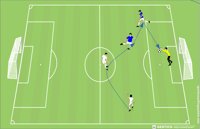 I quattro giocatori devono fare un massimo di quattro passaggi prima di tirare in porta da una distanza minima di 4 m. Se il portiiere para il tiro il giocatore che ha effettuato il tiro viene eliminato. Il gioco termina quando il portiere ha eliminato tutti i giocatori.