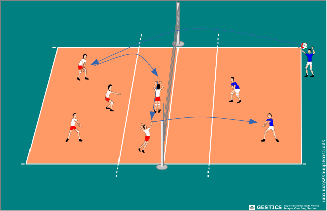 Un giocatore batte, gli avversari ricevono passando la palla in bagher al palleggiatore che alza indietro allo schiacciatore. Lo schiacciatore attacca e glii avversari difendono.