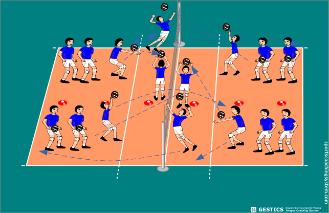 Ci si dispone in 4 file, due per campo (in zona 5 e in zona 1), un palleggiatore per campo, chi è in zona 1 lancia una palla precisa in zona 5, e successivamente chi è in zona 5 fa un appoggio (possibilmente preciso) al palleggiatore, che a sua volta alza la palla in zona 4 (possibilmente precisa), e intanto chi era in zona 5 prende la rincorsa e schiaccia. Poi si gira, chi ha attaccato va a recuperare la palla e si mette in fila in zona 1 (per lanciare la palla in zona 5), e chi era a lanciare la palla, si mette in fila in zona 5 per fare l'esercizio che ha fatto il compagno.