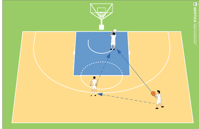 Un giocatore passa la palla all' altro e taglia a canestro,intanto l'altro gli passa la palla e tira