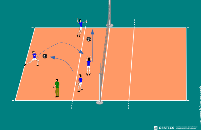 Un ragazzo da zona 2 lancia la palla in zona 6 dove un ragazzo riceve la palla che a sua volta passerà ad un compagno in zona 3 il quale alzerà la palla in zona 4 dove ci sarà un compagno che schiaccerà la palla in zona 1