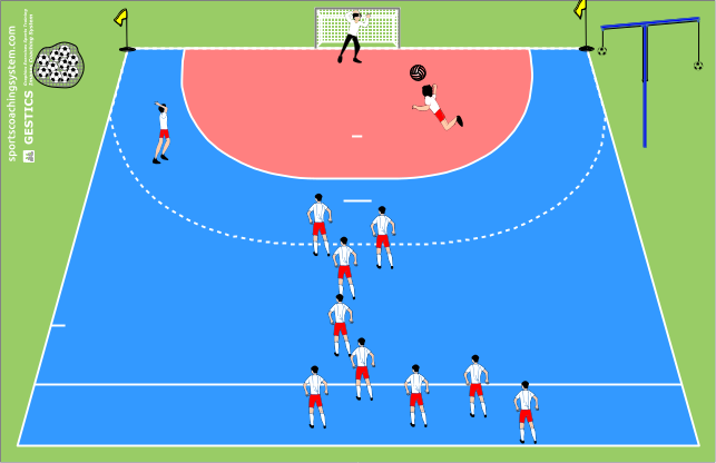 IN QUESTO ESERCIZIO CI SARA'UN ALZATORE CHE DOVRA' ALZARE LA PALLA ALLO SCHIACCIATORE E POI LO SCHIACCIATORE DEVE CERCARE DI FARE RETE IN ARIA, LA RETE DEVE ESSERE ASSEGNATA SOLO SE IL GOL E STATO EFFETTUATO DIETRO LA LINEA GIALLA SE NO VERRA'NUOVAMENTE FATTO.