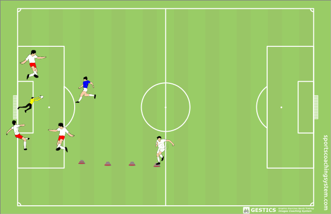 Ci sono 3 giocatori, partiamo con il primo che deve fare lo slalom tra i cinesini e passare il pallone al secondo giocatore e il secondo lo passa al terzo che poi metterà tra lui e il suo compagno per permettere al primo di tirare.IL PORTIERE POI LA DEVE PARARE. Il portiere poi va al posto dell'ultimo, l'ultimo al posto del primo, il primo al posto del secondo e il secondo in porta