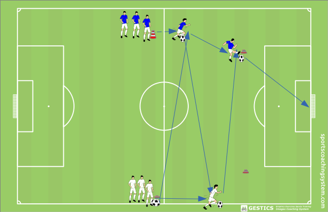 Mentre si passano la palla quello di destra si scambia e va a sinistra e quello di sinistra va a destra ,oppure si fa un'altra colonna in fondo al campo e quando le due persone arrivano al limite dell'area piccola quello che ha la palla deva scartare la persona che arriva da fondo campo
